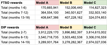 In this study, I modelled the expected FTSO and DIP rewards in the first 18 months based on three Community delegation schemes: